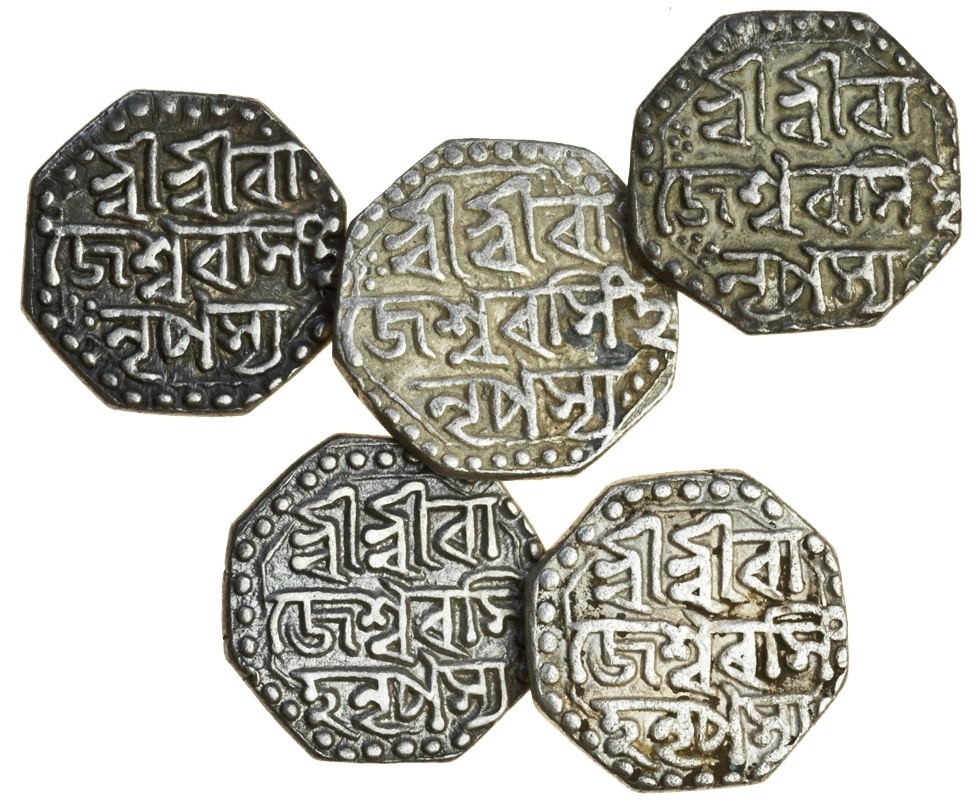 Assam, Rajeśvara Simha (1751-69), octagonal Quarter-Rupees (5), Assamese script, Sk. 1674, 1675, 1676, 1677, 1678, Śrī Śrī Rā/jeśvara Sim/ha Nrpasya, rev. Śāke/ [date], some with slightly different text arrangements, three coins with a crescent and dot above the first line of the reverse (RB. O57.2, 58.1, 59.2, 60.2, O62.2; KM. 132), very fine, scarce (5)