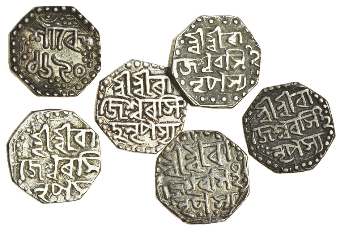 Assam, Rajeśvara Simha (1751-69), octagonal Quarter-Rupees (6), Assamese script, Sk. 1687, 1688, 1689 (3 different types), 1690, legends as previous lot, with simha on the obverse either all on the second line or split between the second and third line (RB. O72.1, 73.1, 74.1, 74.2, 74.3, 76.1; KM. 132), very fine, scarce (6)