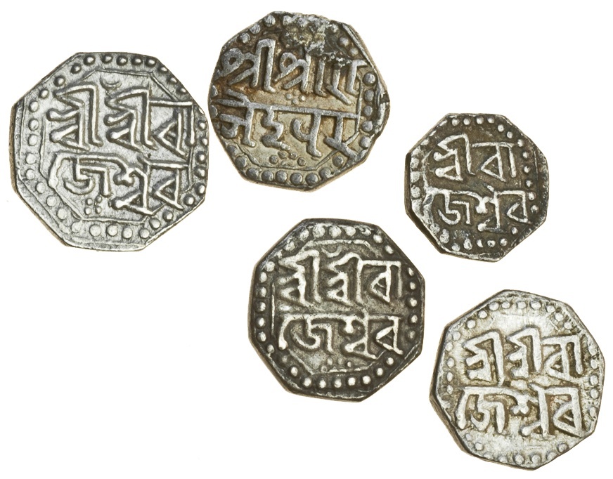 Assam, Rajeśvara Simha (1751-69), octagonal 1/8-Rupees (4), undated, Śrī Śrī Rā/jeśvara, rev. Simha Nr/pasya or Simha/ Nrpasya; octagonal one-sixteenth rupee, undated, Śrī Rā/jeśvara; rev. Simha/ Nrpasya (RB. O77.1, O78.1, O80.1; KM. 130, 131, A132), very fine (5)