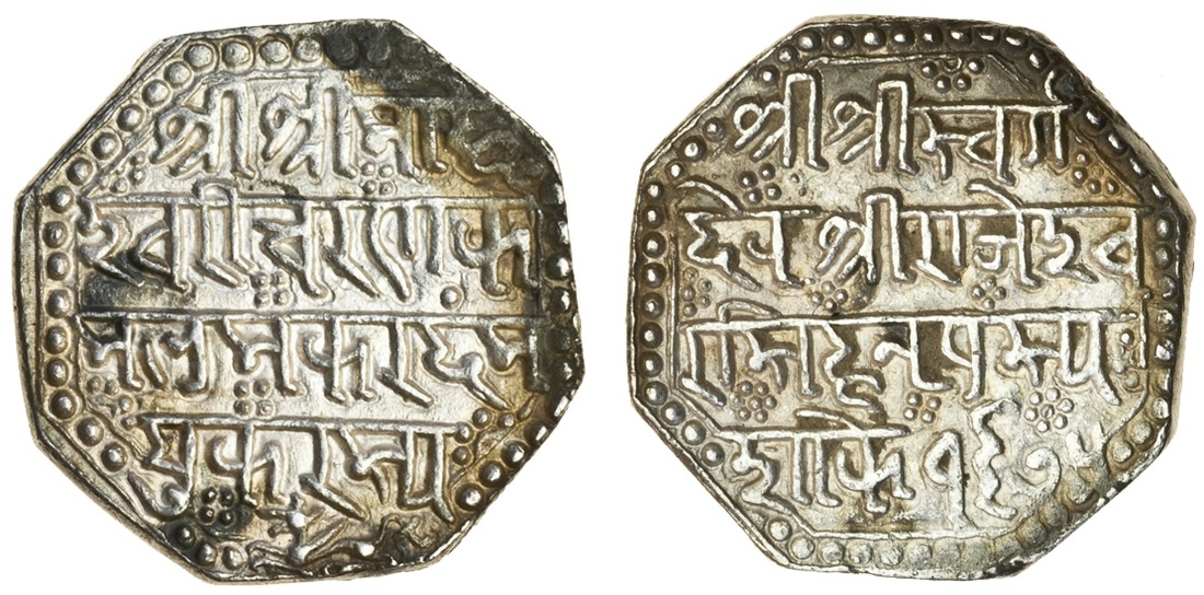Assam, Rajeśvara Simha (1751-69), octagonal Rupee, 11.30g, Sk. 1675, Nagari script, Śrī Śrī Mahe/śvarī Charana Ka/mala Makaranda Ma/dhukarasya, lion running to left below, rev. Śrī Śrī Svarga/ Deva Śrī Rājeśva/ra Simha Nrpasya/ Śāke 1675 (RB. O82.1; KM. 145), reverse with some staining on edge, good very fine, scarce