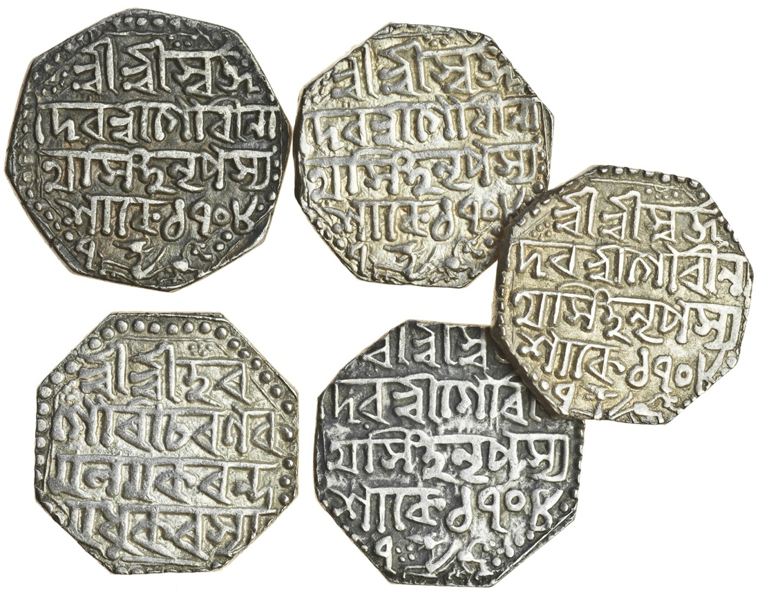 Assam, Gaurinatha Simha (1780-95), octagonal Rupees (5), Sk. 1708, year 7 (5), die varieties (RB. R40; KM. 218), very fine or better (5)