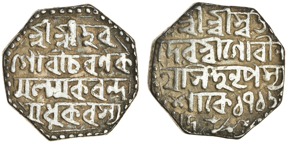 Assam, Gaurinatha Simha (1780-95), octagonal Rupee, 11.28g, Sk. 1716 with 'di' at the bottom of the reverse to the left of the lion, legends otherwise as previous lots (RB. 58.1; KM. 220), toned about very fine, rare