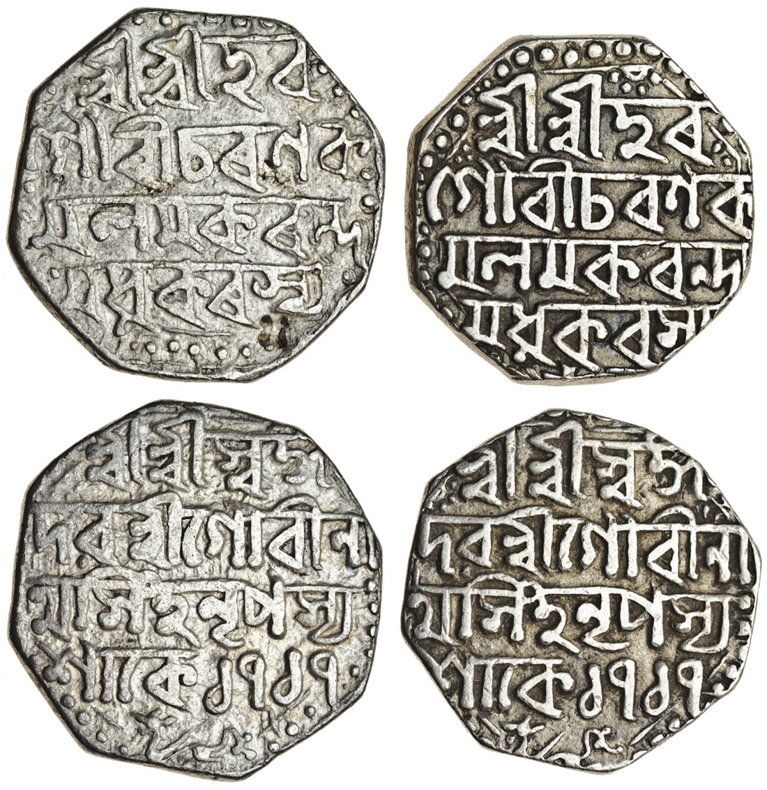Assam, Gaurinatha Simha (1780-95), octagonal Rupees (2), 11.13, 11.23g, Sk. 1717, one with 'di' at the bottom of the reverse, legends otherwise as previous lots (RB. R60, R63.1; KM. 218, 220), very fine, second coin rare (2)