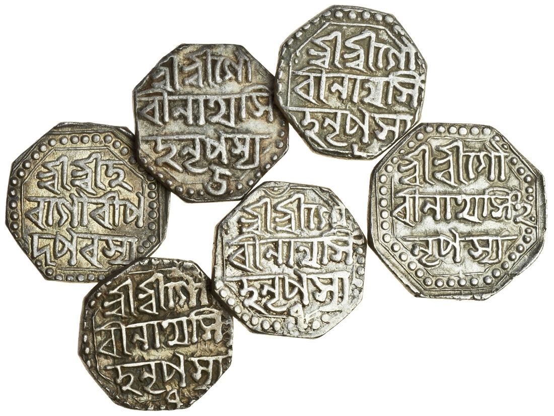 Assam, Gaurinatha Simha (1780-95), octagonal Half-Rupees (6), undated naming Simha (2), undated with Sim/ha, year 5, undated with Si/mha, year 6, undated with Si/mha, year 7 (2), Śrī Śrī Ha/ra Gaurī Pa/da Parasya, rev. Śrī Śrī Gau/rīnātha Simha/ (or Sim/ha, Si/mha) Nrpasya with year, where present, at the bottom of the reverse (RB. R64.1, 66.2, 67, 69, 70; KM. 204, 205), very fine or better (6)