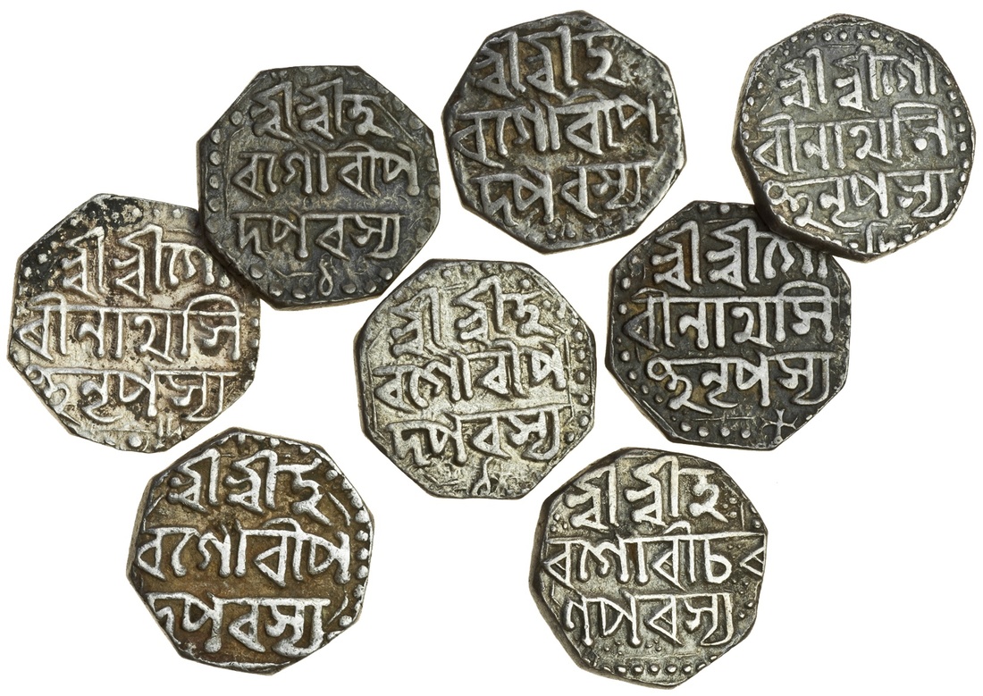 Assam, Gaurinatha Simha (1780-95), octagonal Half-Rupees (8), '1,' at bottom of obverse, 'di' at bottom of obverse (4), cross or letter in same position, undated (2), one with no line over tha, legends as previous lot, Sim/ha or Si/mha (RB. R77.1, 78.1, 87, 87.8, - ; KM. 204, 207, 208), very fine (8)