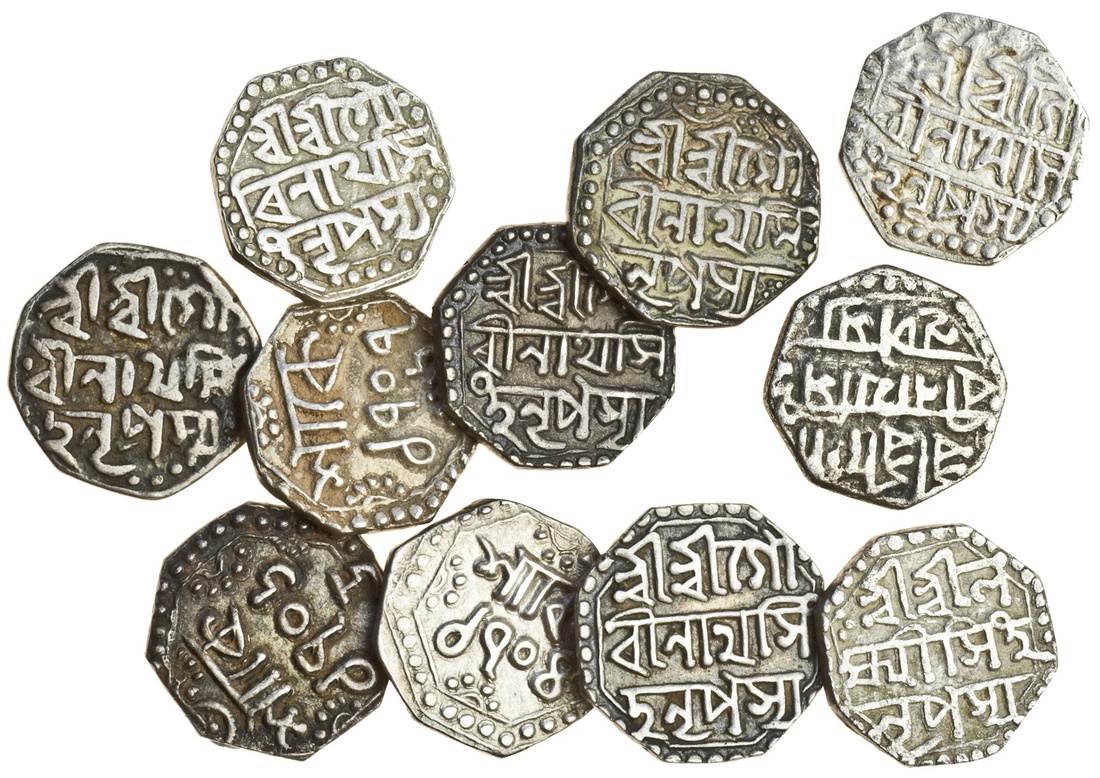Assam, Gaurinatha Simha (1780-95), octagonal Quarter-Rupees (11), Sk. 1703, 1704, 1705, 1706 year 5, 1707 year 6, 1708 (2) one coin year 7, 1709 (2), the first with digit ‘7’ reversed, the second year 8, 1711, 1712 year 11, Śrī Śrī Gau/rīnātha Si/mha (or Simha) Nrpasya, rev. Śake date, with or without regnal year below, including several plate coins from RB (RB. R91.1, 92.1, 93.1, 95.1, 96.1, 97.1, 100.1, 103.1, 105.2, 108.2; KM. 198), very fine or better (11)