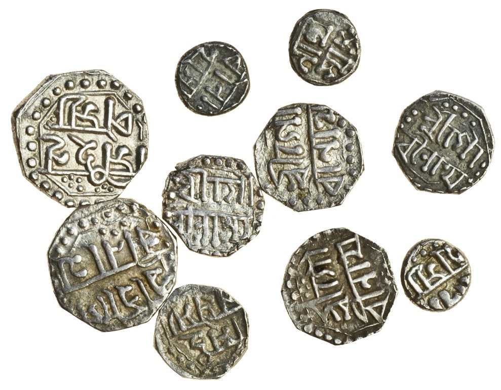 Assam, Gaurinatha Simha (1780-95), octagonal 1/8-Rupees (2), undated, Śrī Śrī Gau/rīnātha, rev. Simha Nr/pasya or Nrpasya, octagonal 1/16-Rupees (5), undated, Śrī Gau/rīnātha, rev. Simha/ Nrpasya; octagonal 1/32 Rupees (3), undated, Śrī/ Gau, rev. rīnā/thasya (RB. R124.1, 126.1, 128.1, 132.1; KM. 190, 193, 196, 197), very fine, scarce (10)