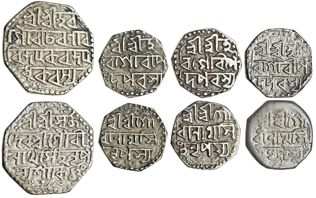 Assam, Gaurinatha Simha (1780-95), 'country-made' octagonal Rupee, 11.12g, dated "Śake 12", octagonal 'country-made' Half-Rupees (3), all undated, usual legends but rather crudely engraved, very fine (4)