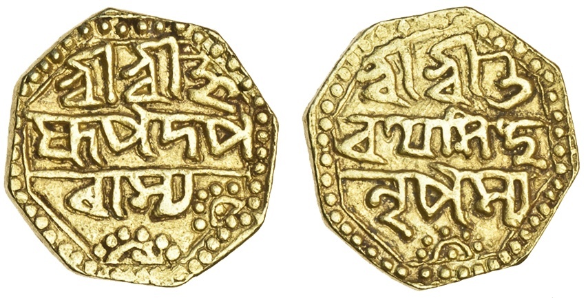 Assam, Bharatha Simha (1789-94, 1796-97), octagonal gold Half-Mohur, 5.79g, undated, Śrī Śrī Kri/shna Pada Pa/rasya, rev. Śrī Śrī Bha/ratha Simha/ Nrpasya (RB. W-; KM. -), very fine, extremely rare gold issue of the Moamarias