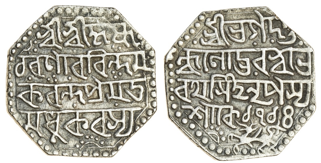 Assam, Bharatha Simha (1789-94, 1796-97), octagonal Rupee, 11.36g, Sk. 1714, Śrī Śrī Krishna/ Charanāravinda Ma/karanda Pramatta/ Madhukarasya, rev. Śrī Śrī Bhagadatta/ Kulodbhava Śrī Bha/ratha Simha Nrpasya/ Śake 1714, winged lion running left, below (RB. W7.2; KM. 405), very fine, scarce
