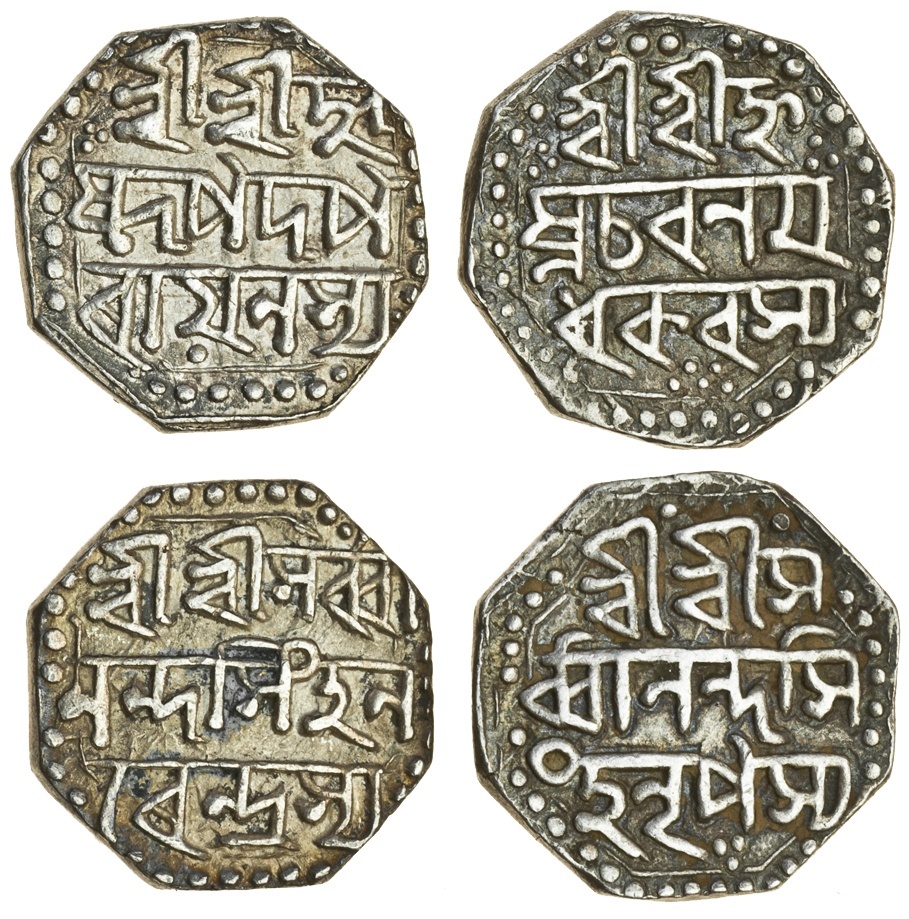 Assam, Sarvvananda Simha (1793-95), in Matak, octagonal Half-Rupees (2), 5.69, 5.67g, undated, different obverse legends, and slightly different reverse legends, the first: Śrī Śrī Kri/shna Charana Ma/dhukarasya, rev. Śrī Śrī Sa/rvvānanda Si/mha Nrpasya, the second: Śrī Śrī Kri/shna Pada Pa/rāyanasya, rev. Śrī Śrī Sarvvā/nanda Simha Na/rendrasya (RB. X.10, X12.2; KM. 303, 306), very fine, scarce (2)