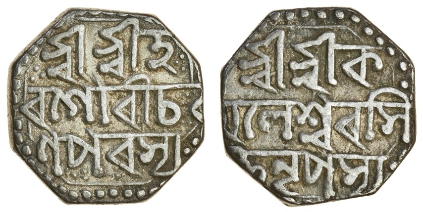 After the death of Gaurinatha Simha, one of his descendents, Kamaleśwara, was placed on the throne by the all-powerful Burha Gohain. The three Gohains were very important councillors of state, little inferior to the king in rank. Although Kamaleśwara began his reign in Sk. 1717 (AD 1795), no coins in his name are known until Sk. 1720 (AD 1798) and even these are all very rare. It seems as though hardly any coins were struck in Assam throughout the whole of Kamaleśvara’s reign, unless coins continued to be struck posthumously in the name of Gaurinatha Simha.