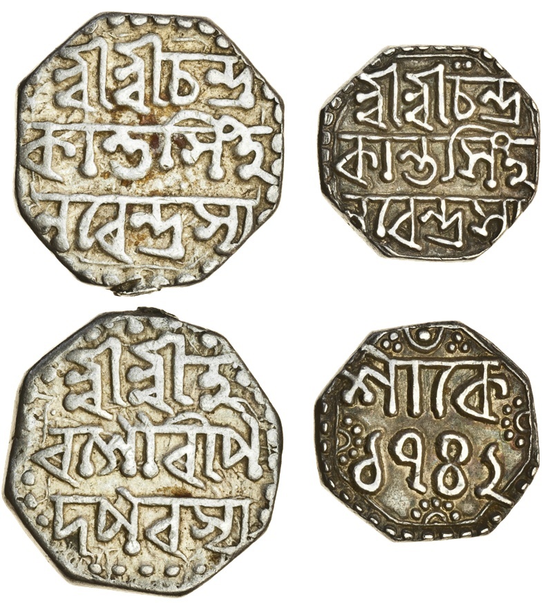 Assam, Chandrakanta Simha (1819-21), octagonal Half-Rupee, 5.60g, undated, Śrī Śrī Ha/ra Gaurī Pa/da Parasya, rev. Śrī Śrī Chandra/kānta Simha/ Narendrasya, Quarter-Rupee, 2.76g, Sk. 1742, Śrī Śrī Chandra/kānta Simha/ Narendrasya; rev. Śake/ 1742 (RB. U10, U12.2; KM. 248, 249), about very fine and about extremely fine (2)