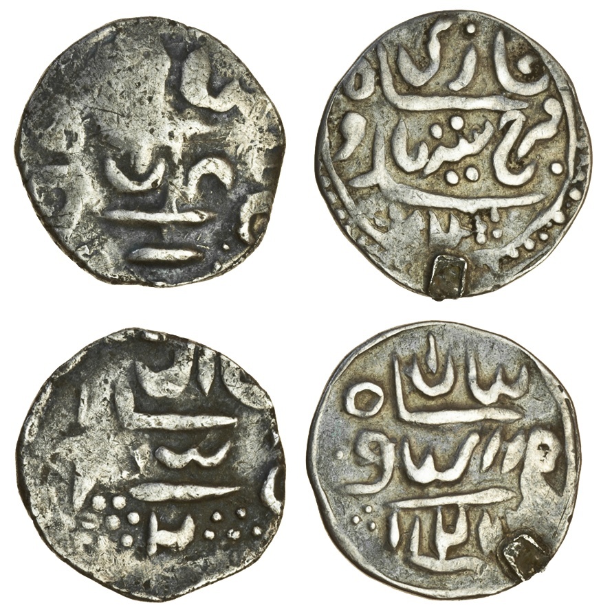 Garhwal, temp.Fath Shah (1686-1717), Timasha, 2.62g, imitating a Nisar type of Farrukhsiyar of Shahjahanabad, dated AH 1125 year 2, farrukhsiyār bādshāh ghāzī, 2 at bottom, rev. blundered Persian legend, 1125 at bottom, together with another similar Timisha, 2.51g, cruder legends (Rhodes, Garhwal and Ladakh, 3, 6; KM.2 (plate coin), 3), the first has been mounted, very fine, the second fine, extremely rare (2)