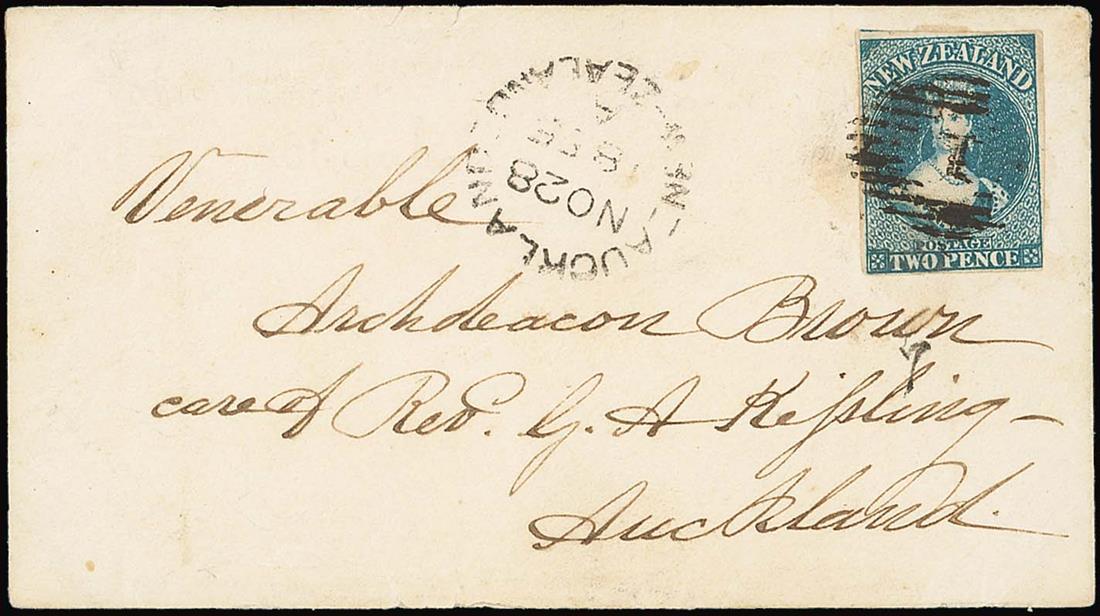 1855 (28 Nov.) envelope from Auckland and addressed locally to Archdeacon Brown, bearing 1855 London printing 2d. dull blue with clear to very large margins all round except at lower right where just touched at one point, cancelled "1" and with fine datestamp alongside. Fine and scarce, being the 8th. oldest surviving cover addressed to an internal destination. Photo