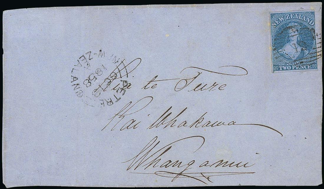 1858 (13 Oct.) front, addressed in Maori, from Petre to "Kia te Ture, Kai Whakawa, Wanganui", bearing 1856 blue paper 2d. with three good to large margins (touched or cut-into at right) cancelled "12" and with Petre datestamp at left; three light vertical folds all clear of the adhesive which has three tiny age spots. Photo