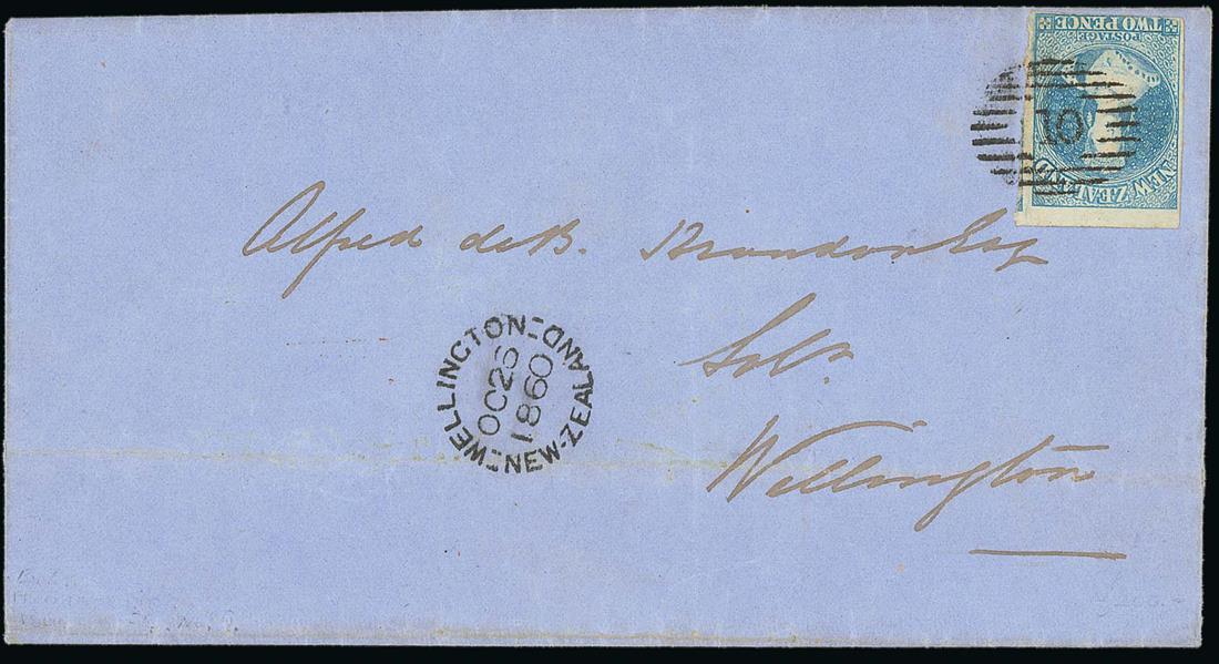 1860 (20 Oct.) entire letter from Dunedin to Wellington, bearing 1857-63 2d. pale blue with large to enormous margins on three sides (touched at foot) cancelled by superb "10" and with equally fine arrival c.d.s. at left. Photo