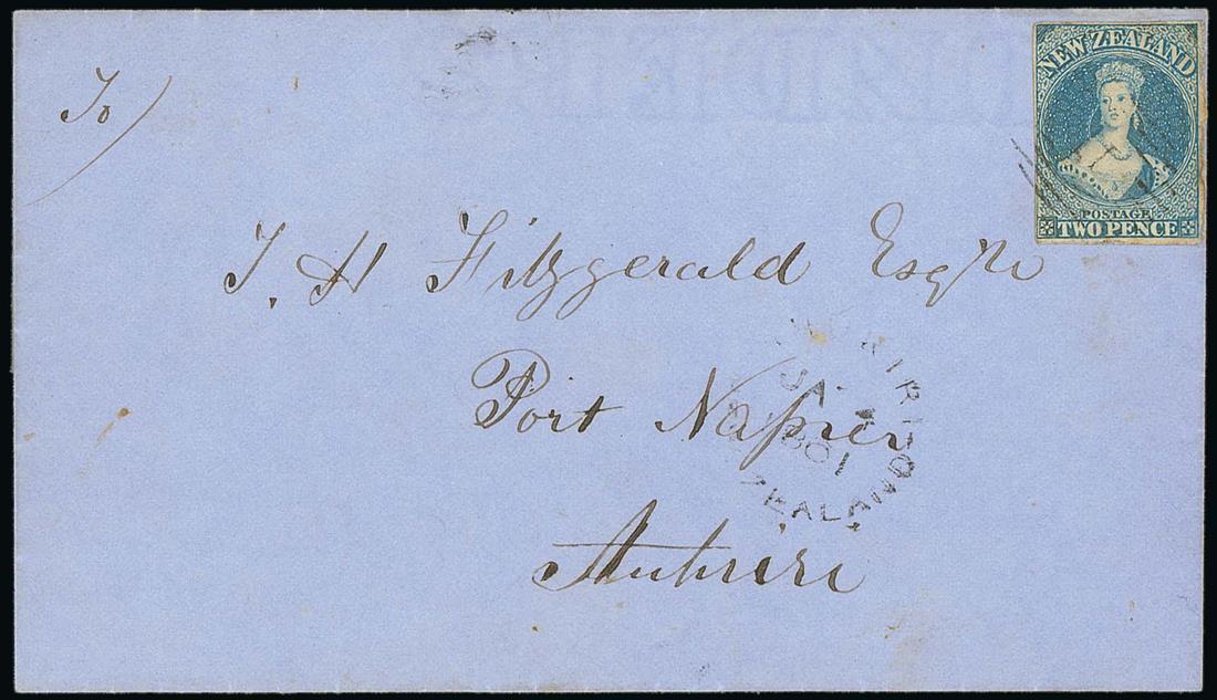 1861 (4 Jan.) entire from Ahuriri to Port Napier, bearing 1857-63 2d. pale blue with margins all round (a trifle soiled) cancelled "11" and with light Ahuriri c.d.s. below. Photo