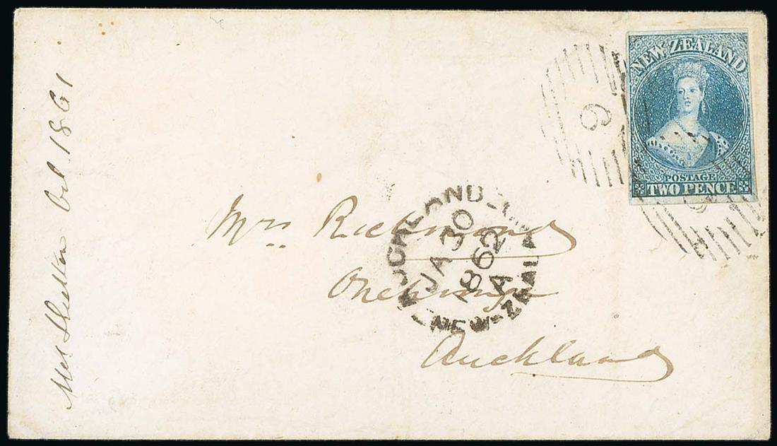 1862 (29 Jan.) envelope from New Plymouth to Auckland, bearing 1857-63 2d. blue with clear to large margins and twice cancelled "6" with arrival c.d.s. (30.1) alongside, despatch c.d.s. on reverse. Holcombe Opinion (1992) stating that the stamp has been lifted and replaced. Photo