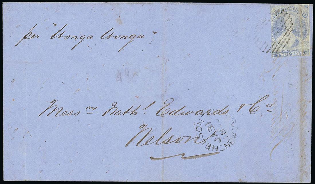 1863 (28 Jan.) entire from Wellington "pr Wonga Wonga" to Nelson, bearing 1862-63 pelure paper imperf. 2d. pale ultramarine with margins in places and lightly cancelled "7", arrival c.d.s. (31.1) below, despatch c.d.s. on reverse; the entire with three vertical creases, one of which additionally ties the adhesive. A rare stamp on cover. Photo