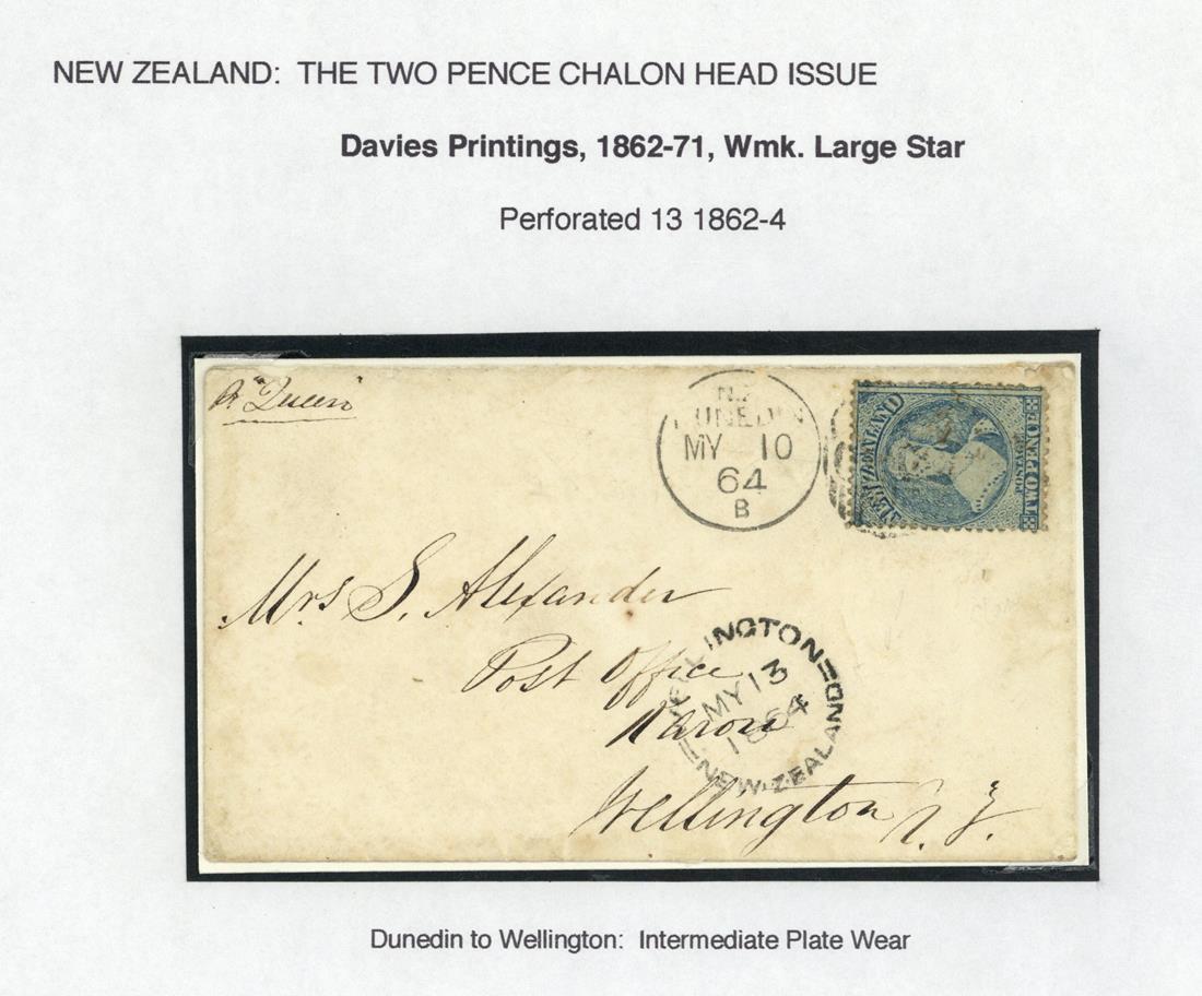 1864 (10 May) envelope from Dunedin to Wellington, bearing 1862-64 perf. 13 2d. cancelled by light duplex and with arrival c.d.s. (13.5) below, 1864 (18 Sept.) envelope addressed in Maori from Greytown to Ahuriri, bearing 1862-64 perf. 13 2d. cancelled by boxed "4" obliterator and with "w" despatch and arrival c.d.s. alongside, all indistinct strikes, and 1864 (11 Nov.) envelope from Nelson to Canterbury bearing 18620-64 perf. 13 2d. (imperforate at foot) cancelled "14" and with Christchurch c.d.s. (15.11) at centre