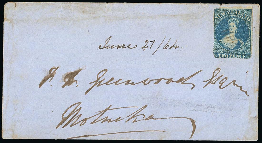 1864 (27 June) envelope ex the Greenwood correspondence from Nelson to Motueka, bearing 1862 serrated 16 or 18 2d. deep blue showing serrates at left, at foot and traces elsewhere, lightly cancelled and showing trace of Nelson c.d.s. on reverse; the envelope refolded at foot and with a few faults on reverse; one of two known from this correspondence. A very rare stamp on cover. S.G. 60. Photo