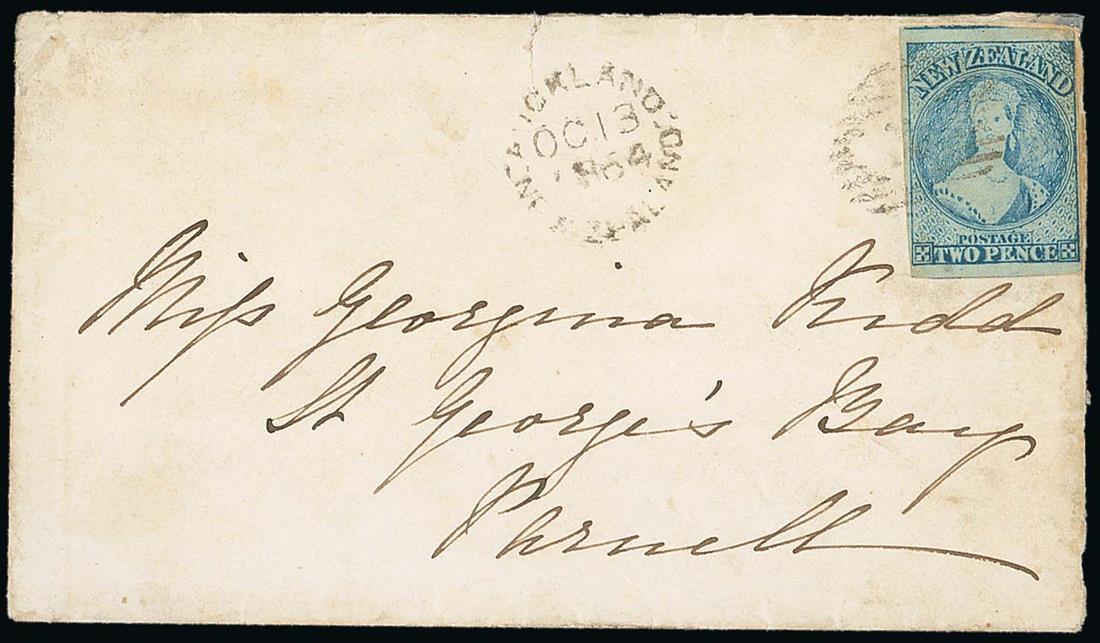1864 (13 Oct.) envelope from Auckland addressed locally to "St. Georges Bay, Parnell", bearing 1862 2d. pale blue with clear to large margins virtually all round and lightly cancelled "1" with Auckland c.d.s. alongside; envelope with small tear at top centre, otherwise fine. Photo