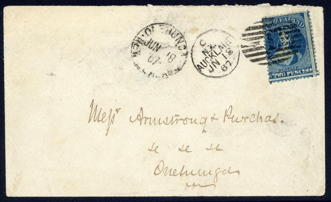 1867 (18 June) envelope from Auckland to Onehunga, bearing 1864-71 2d. deep blue Plate II with double row of horizontal perfs. through value tablet, cancelled "1" in oval of bars and with despatch and arrival (18.6) alongside; unusual