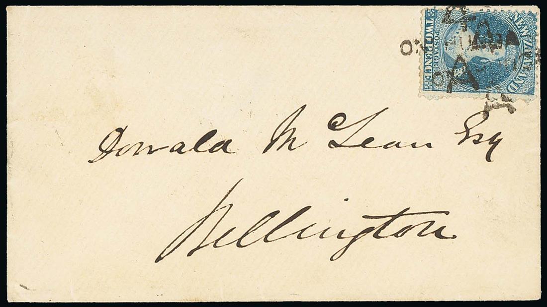 1871 (17 June) envelope from Onehunga to Wellington, bearing 1864-71 2d. blue Plate II (vertical ridge from previous contents) twice cancelled by scarce "4/onehuga.a" unframed handstamp, the reverse with despatch, Nelson (20.6) and arrival (21.6) c.d.s.; very fine. Photo