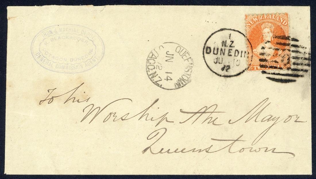 1872 (10 June) envelope (tears on flap) from Dunedin to Queenstown, bearing 1871 2d. orange (lifted and hinged back in place) neatly cancelled by "O" duplex with arrival c.d.s. (14.6) alongside