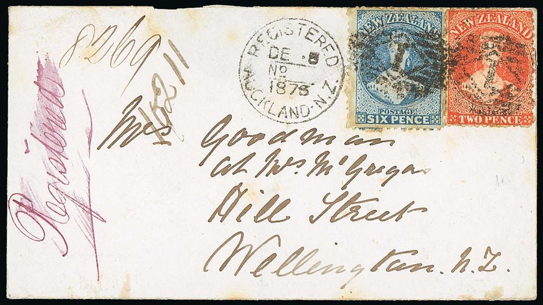 1876 (8 Dec.) envelope registered from Auckland to Wellington, marked "Registered" at left and bearing 2d. orange and 6d. blue both cancelled "1" in diamond in oval of bars and with "registered/no. /auckland.n.z." c.d.s. alongside; flap missing and with traces of light tones though an attractive registered franking. Photo