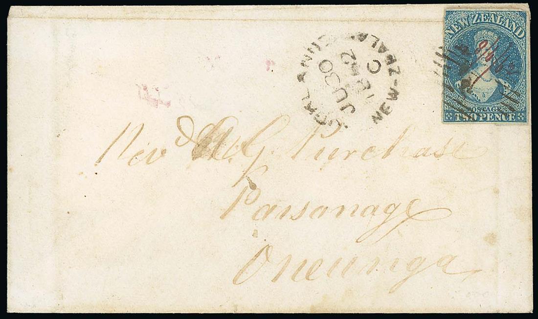 1862 (28 June) envelope from Mauku to Onehunga, marked "Mauku 28/6/62" on reverse and bearing 1862 2d. deep blue with three margins (roughly severed at left and hinged in place) cancelled with manuscript "28/6/62" and "1" in oval of bars with Auckland c.d.s. (30.6) alongside. Photo