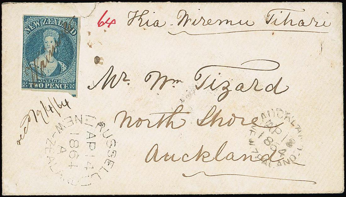 1864 (12 Apr.) envelope from Waimate to Auckland, marked "Waimate April 12./64" on reverse and bearing 186-64 2d. blue with clear to large margins mainly all round and cancelled "Waimate", Russell c.d.s. (14.4) below and arrival c.d.s. (18.4) at lower right; fine and rare. Holcombe Certificate (1992). Photo