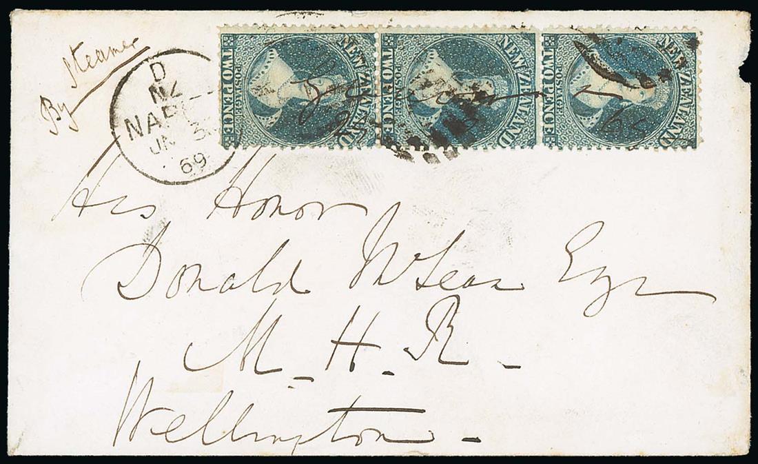 1869 (29 June) envelope from Gwavas "By Steamer" to Wellington, bearing 1864-71 2d. blue vertical strip of three sharing manuscript "Gwavas 29.6.69" and part strikes of a Napier "n/1" duplex, arrival c.d.s. (5.7) on reverse. Photo