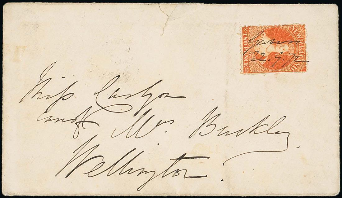 1872 (22 Sept.) envelope to Wellington, bearing 1871 2d. orange placed sideways and cancelled "Gwavas 22.9.72", Napier and arrival c.d.s. on reverse. Photo