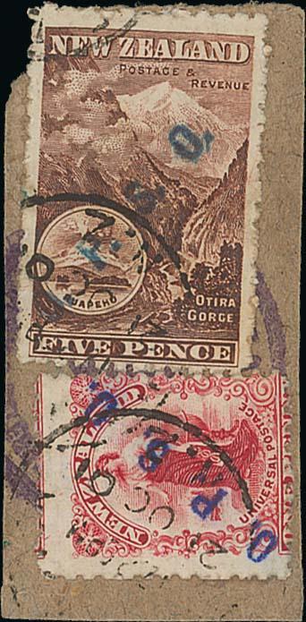 No watermark, perf. 11 5d. purple-brown handstamped in blue-green together with Universal 1d. handstamped in violet, both cancelled by indistinct 1901 datestamp and tied to small piece showing Official Frank in violet below. Two RPSNZ Certificates (1998), one for each stamp. EP13b, GP2a, $5,500; S.G. O20b, 24. Photo