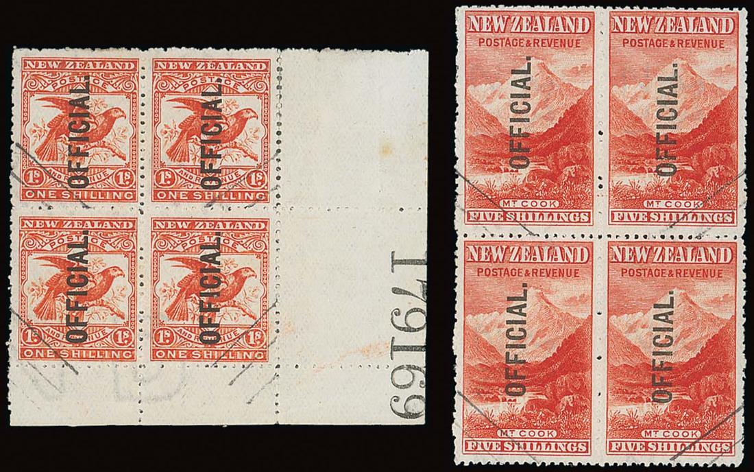 2d., 3d., 1/-, 5/- and 1908-09 small format 6d., all in blocks of four, and 1/- single, all cancelled by two parallel lines in one corner, the 2d. marginal, the 1/- from the lower right corner with sheet number "179169"; a fine, scarce and impressive group. Photo