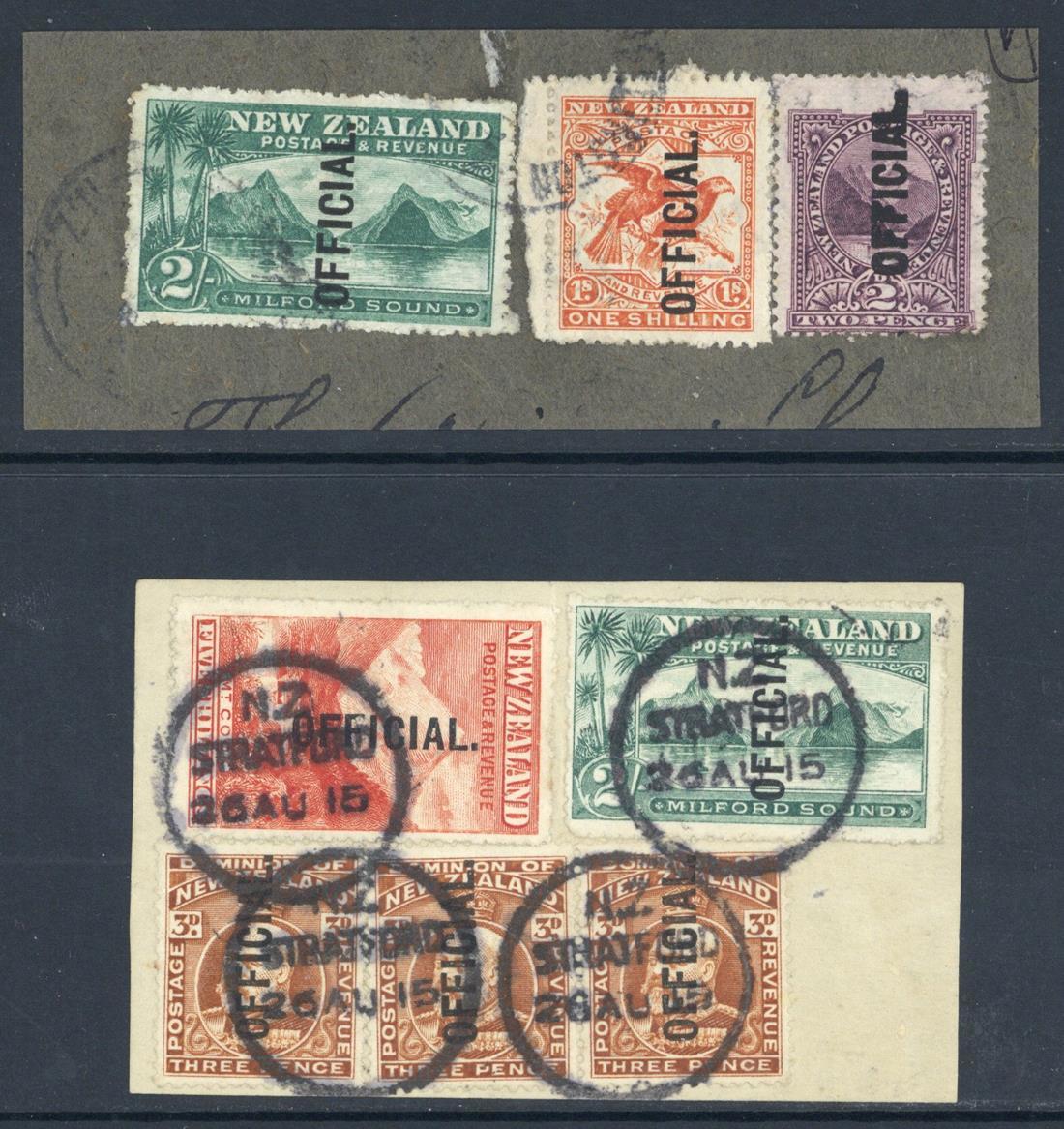 2d., 1/- and 2/- cancelled by light Wellington datestamps on small parcel piece, 3d. strip of three, 2/- and 5/- all neatly cancelled by Stratford datestamps on 1915 piece. Cat. $2,585; S.G. cat. £360. Diamond page 257