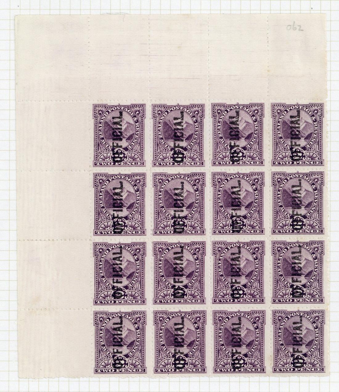 2d. reddish purple upper left corner block of sixteen, fresh mint and mounted in margins only, and a block of four with the lower pair unmounted. EO6b(1)(2), $1,040; S.G. O61a, £170