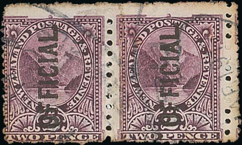 3d. bistre-brown with mixed perfs. at top, neatly cancelled by Greymouth 1908 squared-circle datestamp; fine and very rare. R.P.S. Certificate (1991). EO9f, $3,000; S.G. O63a, £1,500. Diamond page 252. Photo