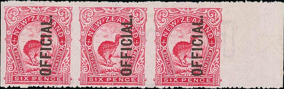 6d. bright carmine-pink marginal strip of three from the right of the sheet, variety imperforate vertically, fresh mint with a few hinge remainders; one with a tiny thin though of fine appearance and a scarce multiple. EO14g(Z), $4,500+; S.G. O64a, £1,500. Diamond page 252. Photo