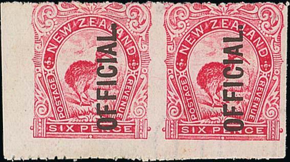 6d. bright carmine-pink marginal horizontal pair, variety imperforate vertically, lightly mounted mint; perfs. fractionally trimmed at foot. Scarce. EO14g(Z), $4,500; S.G. O64a, £1,500. Photo
