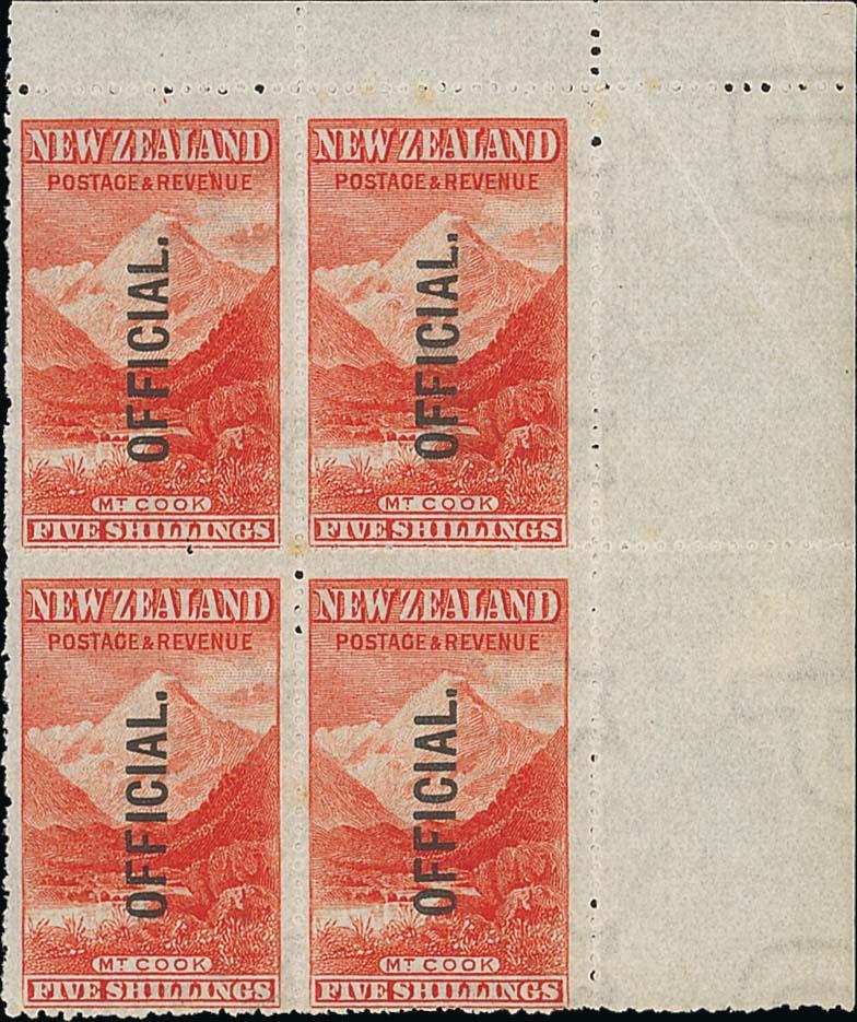 5/- deep red with watermark sideways, an upper right corner block of four, unmounted mint; a couple of tiny light tones and crease in margin, otherwise fine. A scarce and impressive multiple. EO21e, $4,800; S.G. O67, £680. Photo