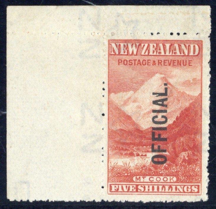 5/- deep red with watermark sideways, an upper left corner example, variety split "l", mint with a patch of gum loss at top. EO21e var.; S.G. O67 var. Diamond page 247