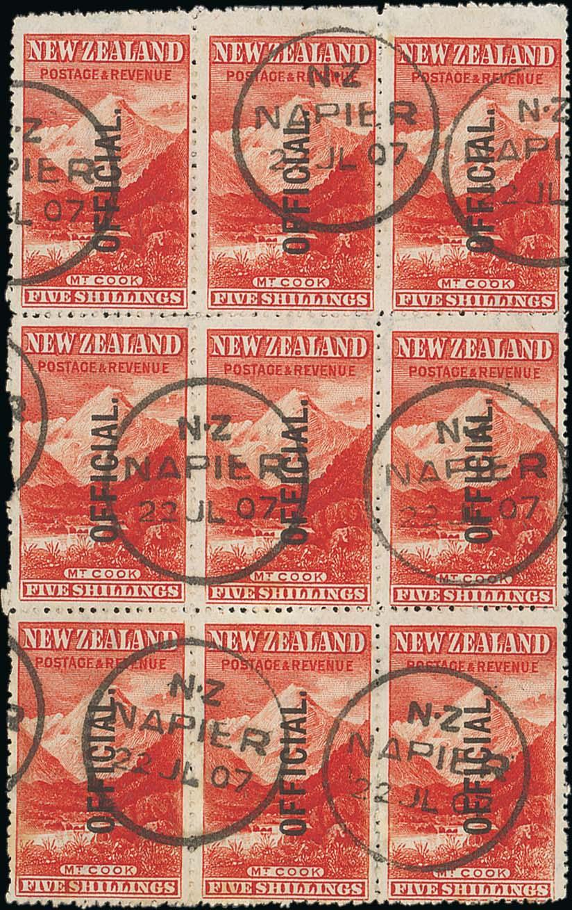 5/- deep red with watermark sideways, a block of nine all neatly cancelled by Napier 1907 datestamps. Diamond page 246 states "probably for paying a Certificate of Posting for a large (i.e. heavy) Government parcel. A fine, rare and impressive multiple. EO21e, $4,500; S.G. O67, £1,710+. Diamond page 246. Photo