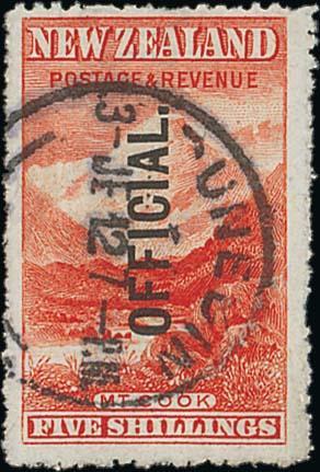 5/- deep red with watermark upright, cancelled by large part Dunedin 1912 datestamp; fine and scarce. EO21f, $5,000; S.G. O67a, £1,200. Photo