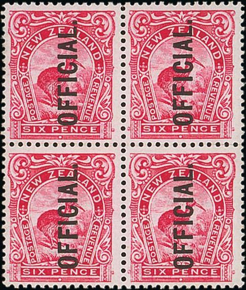 6d. pink perf. 14x15 block of four, well-centred and fresh mint with the lower pair unmounted; a couple of split perfs. between at right. EO15c, $6,000; S.G. O72, £900. Photo