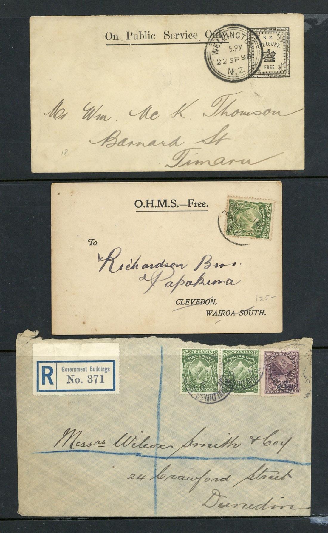 1898 (22 Sept.) N.Z. Treasury OPSO envelope with imprinted "free" stamp and used from Wellington to Timaru, 1908 "o.h.m.s. Free." postcard from the Commanding Officer of the Franklin Mounted Rifle Volunteers at Clevedon to Papakura bearing unoverprinted ½d. with light datestamp, and 1909 envelope registered from Government Buildings, Wellington to Dunedin, bearing unoverprinted ½d. pair and 2d. with datestamps and registered label at left, the reverse bearing "confidential" label tied by despatch and arrival datestamps. An unusual trio. Diamond page 249