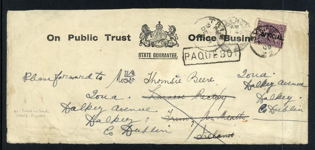 1907 OPSO envelope from Auckland to Paris bearing ½d. and 2d., 1909 OHMS envelope registered from Auckland to Belgium bearing 3d., 1909 On Public Trust Official Business State Guarantee envelope (226x103mm.) envelope to Ireland and twice redirected internally, posted on board ship and bearing 2d. cancelled in transit at Sydney, and 1912 OHMS window envelope (222x102mm.) from Wellington to Switzerland bearing 2d. pair and with arrival datestamp on reverse. An unusual group. Diamond page 255