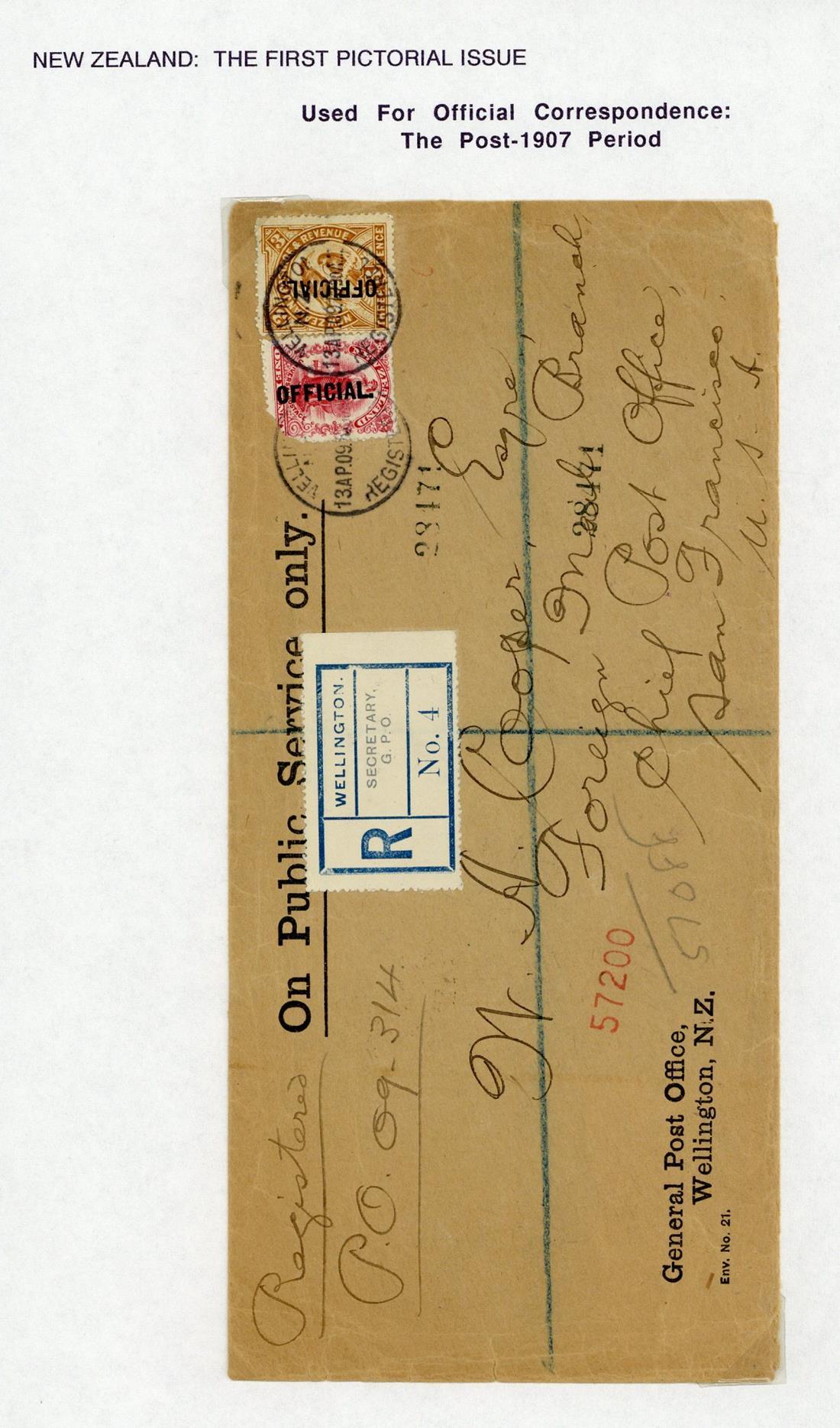 1909 (13 Apr.) OPSO envelope from the General Post Office in Wellington and registered to the Chief Post Office in San Francisco, bearing 3d. and 1d. Universal (defective) cancelled by datestamps and with Wellington G.P.O. registration label alongside, complete with letter to the addressee who had obviously complained that used stamps sent previously had not arrived in good condition; most unusual